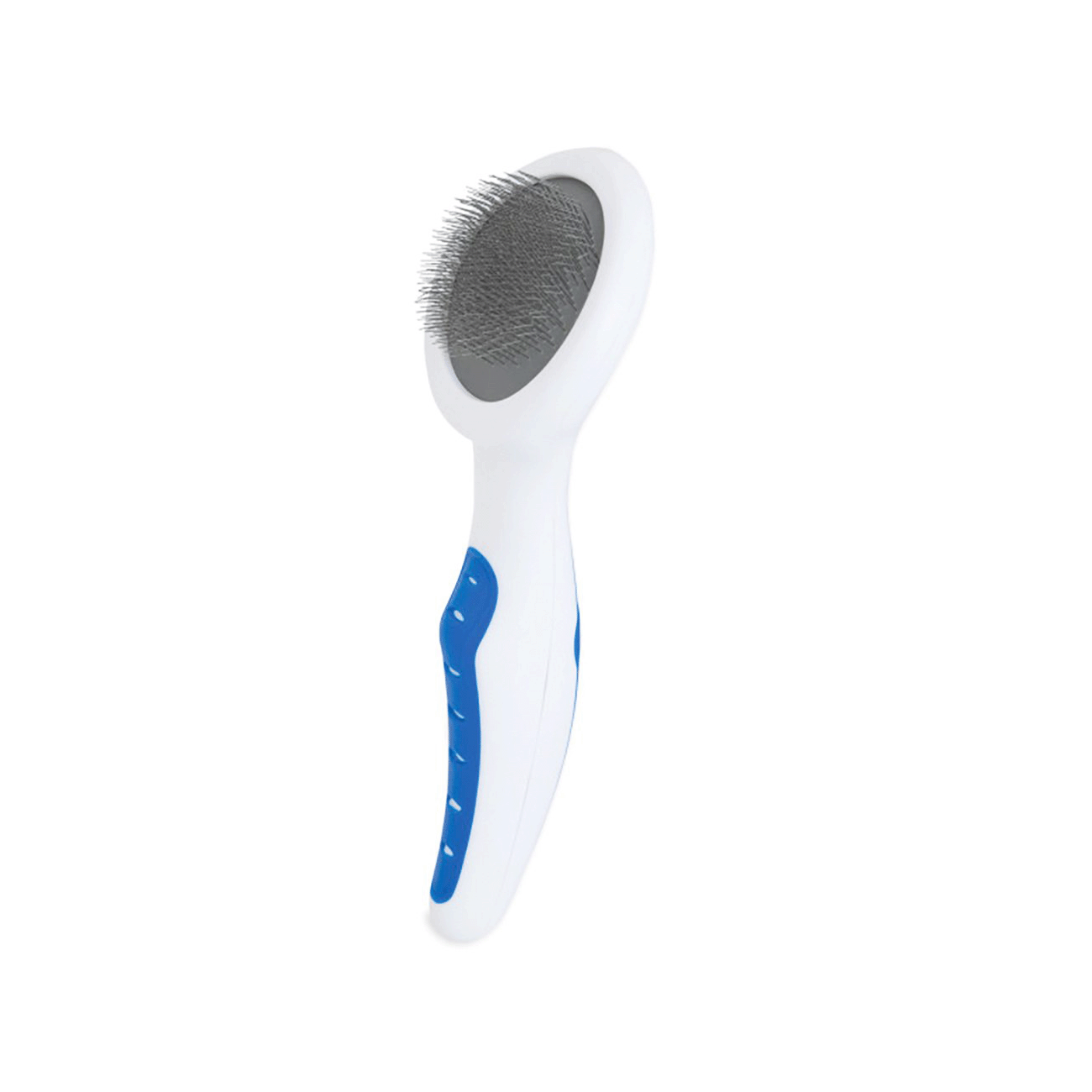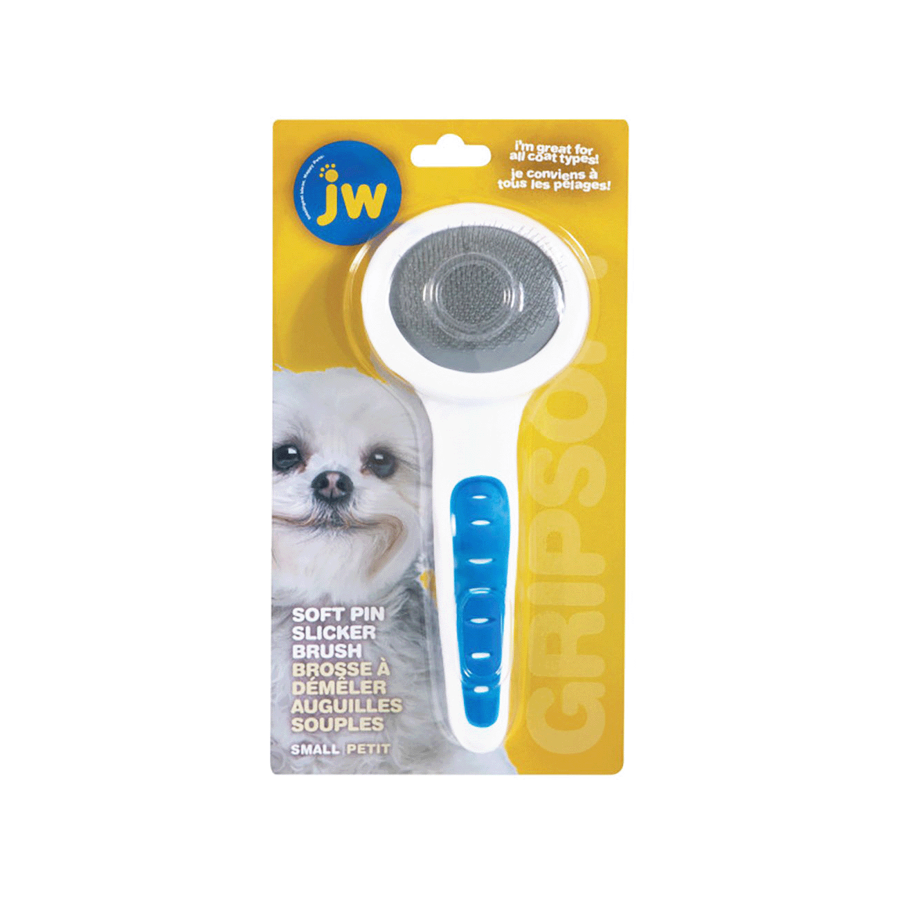 The JW GripSoft Soft Pin Slicker Brush Grooming Tool is ideal for dogs with delicate coats. Removes dead and shedding hair. Helps untangle mats and snarls.