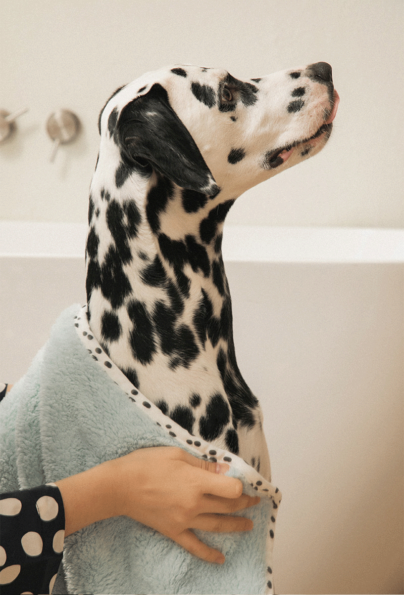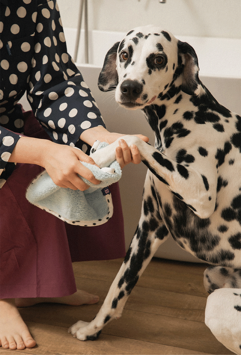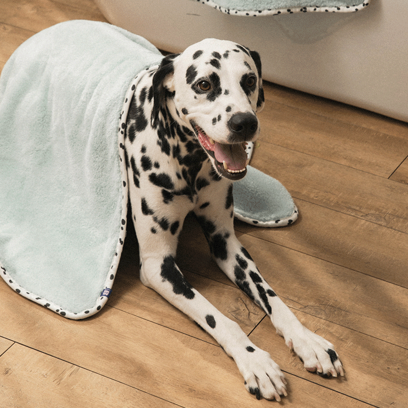Crafted from premium microfibre, it gently soaks up water four times faster than regular towels, helping to shorten drying time and reduce post-bath stress for your pup. The plush texture stays soft even after multiple washes, and the charming polka-dot trim adds a playful touch to bath time.