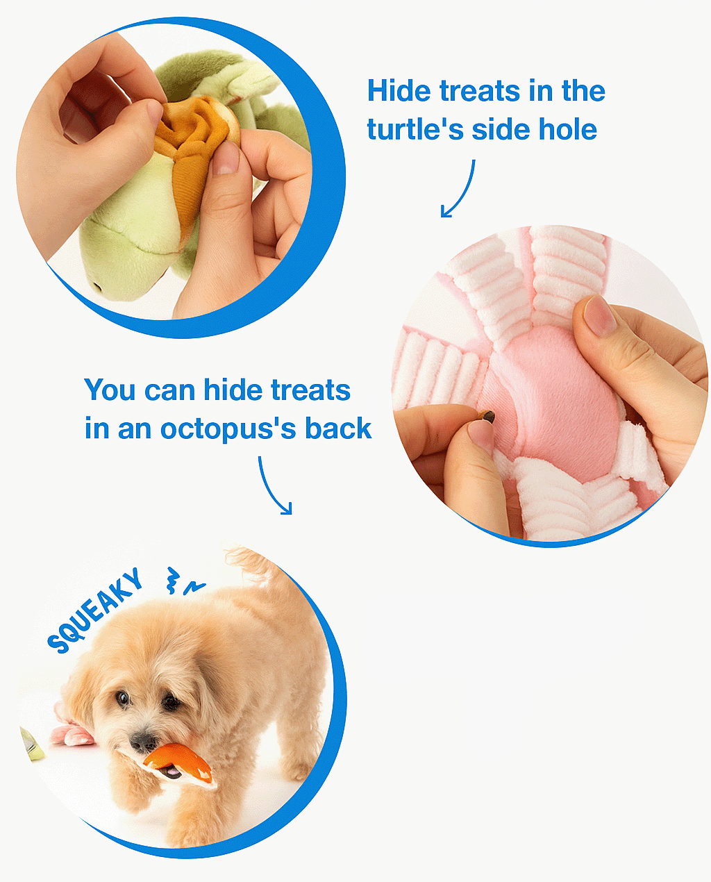 Perfect for gentle chewers and curious pups, the Sea Friends are designed with hidden treat pockets so you can turn playtime into a mini treasure hunt.