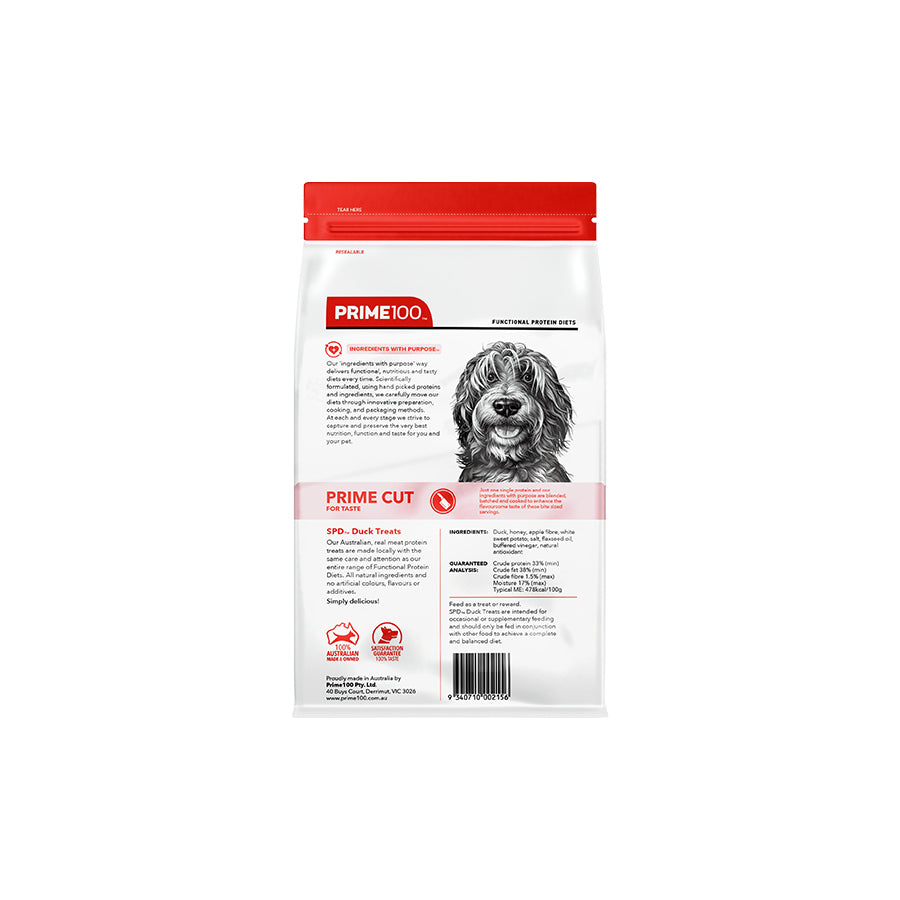 The Prime100 SPD Prime Cut is a real meat protein treats. The SPD Prime Cut Duck Treats are made locally with the same care and attention as our entire range of Functional Protein Diets. All natural ingredients and no artificial colours, flavours or additives.